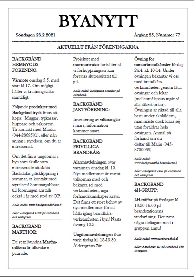 "Utöver den info som byns föreningar delar med sej om kommande verksamhet skriver vi också om trevliga händelser i byn, publicerar familjenyheter relaterade till Backgränd och vi kommer också att dela med oss av någon liten glimt av Backgränds historia i varje nummer.