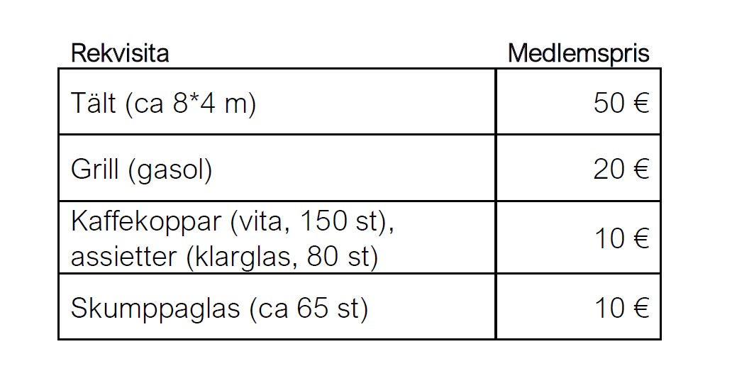 Om du ska ställa till kalas eller bjudning av något slag där hemma så finns det ett och annat i hembygdsföreningens ägo som medlemmarna har möjlighet att hyra. Ta kontakt med Malin Wikström (+358 45 873 0069) eller någon i styrelsen!